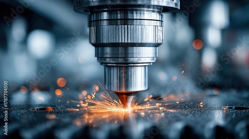 Close-up of a laser cutting metal with sparks flying in a manufacturing process