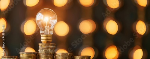 Close-up of a lit lightbulb on top of stacked coins against a background of blurred golden lights, symbolizing idea, innovation, and financial investment.