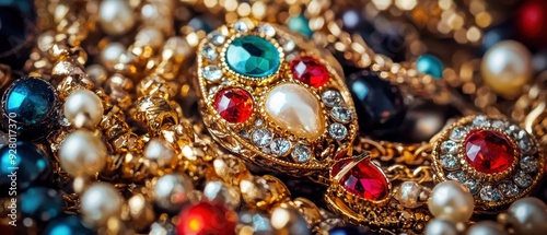 Close-up of a luxurious vintage jewelry chain adorned with colorful gemstones and intricate details.