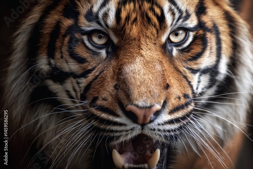 Close-up of a majestic tiger's face, showcasing its intense gaze and striking features.