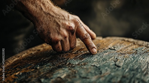 Close-up of a male hand, possibly Caucasian, gently touching textured wood, evoking a sense of craftsmanship.