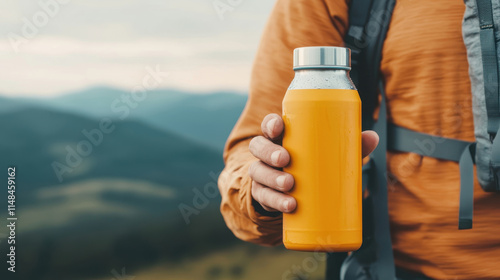 Close-up of a man climber holding a stainless steel water bottle. copy space