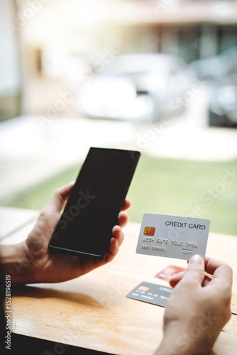 Close-up of a man filling in credit card information on a smartphone to complete a payment transaction. Online shopping, payment, login.