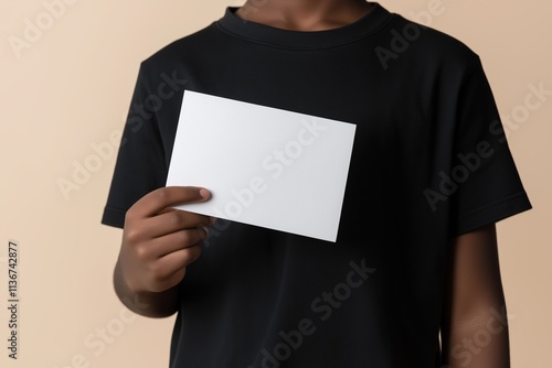 Close-up of a man in a black t-shirt holding a blank white card, with focus on copy space and simplicity