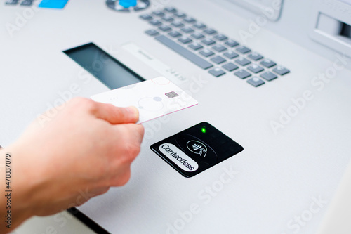 Close-up of a man using his credit card at an ATM with Contactless technology.