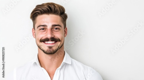 Close-up of a man with a bold handlebar mustache smiling against a white background with text space