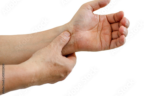 Close-up of a man's arm holding a sore wrist from long hours of work on a computer and laptop. Concepts of carpal tunnel syndrome, arthritis, and neurological disorders. numbness in one's