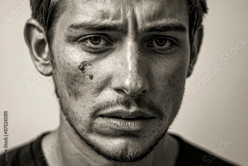 Close-Up Of A Man's Face Showing Deep Emotional Distress, Tear-Streaked Cheeks, Furrowed Brows