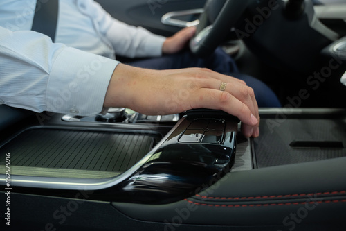Close-up of a man's hands on the automatic transmission of a modern car.