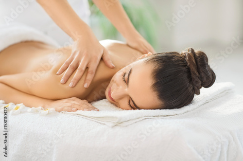 Close-up of a masseuse or physiotherapist massaging positive patient back, easing muscle tension during spa treatment, therapy service, relieving discomfort in a calm salon atmosphere.