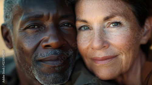 Close-up of a mature, interracial couple with love and warmth, highlighting their happy expressions and togetherness, ideal for concepts of unity.