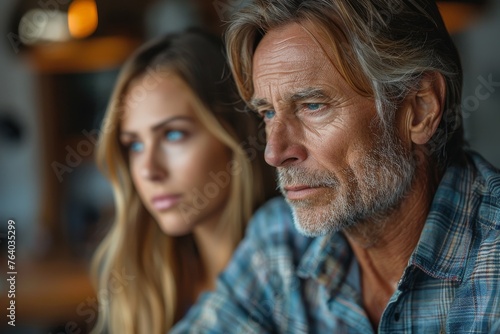 Close-up of a mature man with contemplative expression and a woman in soft focus looking away