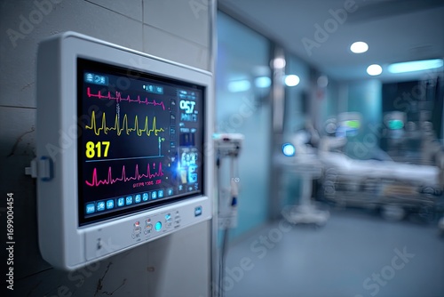 Close-up of a medical monitor displaying vital signs in a hospital room. Blurred background shows medical equipment and a bed
