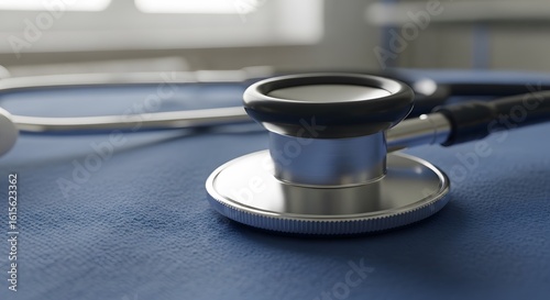 Closeup of a medical stethoscope resting on a blue examination table, reflecting the sterile environment of a healthcare facility. Precision instrument for diagnosis.
