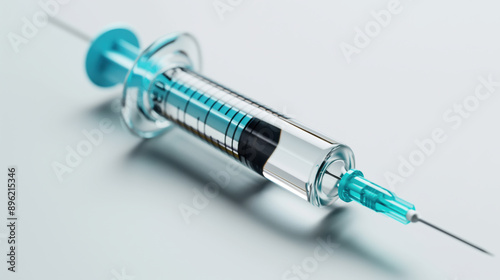 Close-up of a medical syringe with a clear body and turquoise plunger on a light background.