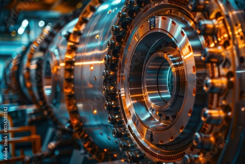 Close-up of a metallic turbine engine component, intricate design and details.