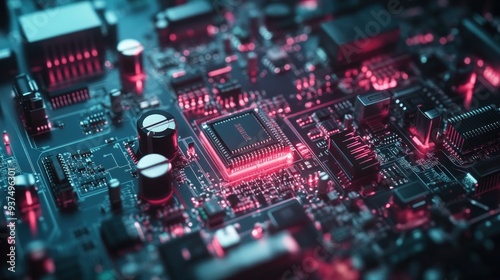 Close-up of a Microchip with Pink Glowing Lines on a Circuit Board