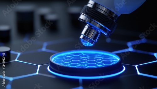 Close-up of a microscope focusing on a droplet over a hexagonal substrate, showcasing advanced technology.