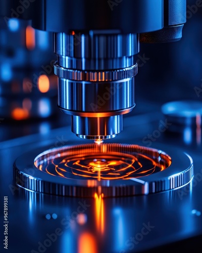 Close-up of a microscope with intricate details showcasing scientific technology and precision in a laboratory setting.