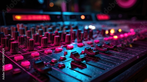 Close-up of a mixing console illuminated with pink and blue lights, creating a vibrant atmosphere in a recording studio Generative Ai