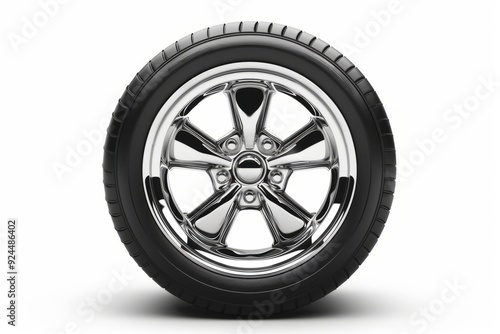 Close-up of a modern car wheel with chrome alloy rim on white background. High detail, clean style. Ideal for automotive, design, and repair themes. Generative AI