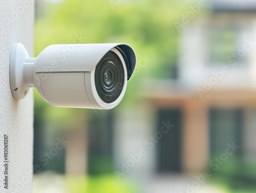 Close-up of a modern outdoor security camera mounted on a wall, focusing on surveillance with blurred residential area in the background.