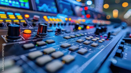 Close-up of a modern sound mixing console with illuminated buttons and screens in a studio