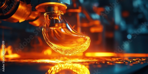 Close-up of a molten glass production process, showcasing a vibrant glowing form being shaped under intense heat and craftsmanship.