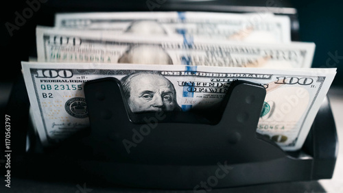 Close-up of a money counting machine sorting hundred dollar bills against a dark background symbolizing wealth, capitalism and investment. Emphasis on currency and economic growth.