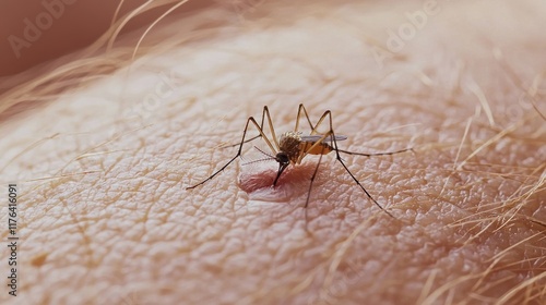 Close-Up of a Mosquito Feeding on Human Skin with a Visible Bite, Highlighting the Intricacies of Nature's Tiny Creatures and the Impact on Human Health