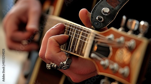 Close-up of a Musician's Hand Playing a Guitar with Silver Rings