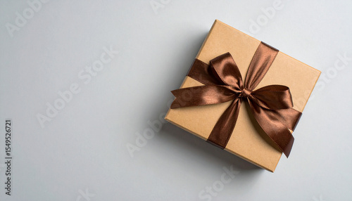 Close-up of a neatly wrapped present with a brown satin ribbon on a gray surface is inviting