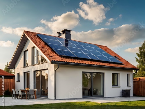 Close-up of a new suburban house with a photovoltaic system on the roof. Simple and modern environmentally friendly house with solar panels on the gable roof, with sunlight during the day