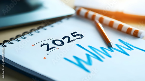 Close-up of a notebook showing the year 2025 with a financial graph and stationery.
