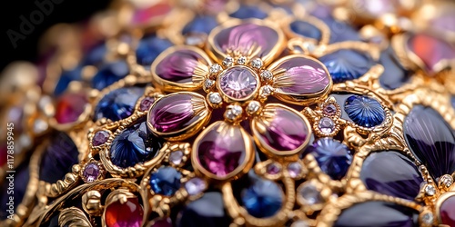 Close-up of a ornate gold and gemstone sphere with a floral design.