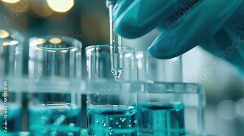 Close-up of a pair of hands wearing blue gloves as they use a pipette to transfer a small amount of liquid into a test tube in a laboratory setting, demonstrating precision and care.