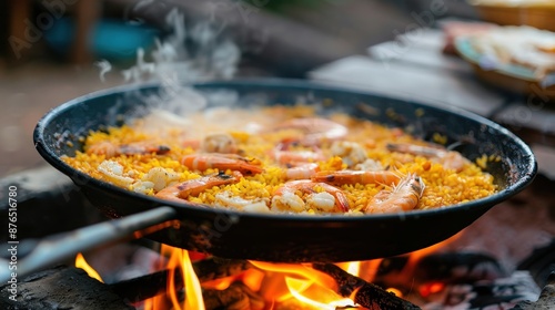 Close-up of a pan with delicious seafood paella cooking over an open flame, showcasing shrimp and rice for an outdoor culinary experience.