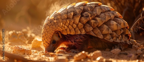 Close-up of a pangolin foraging in warm sunlight, surrounded by sand and sparse vegetation