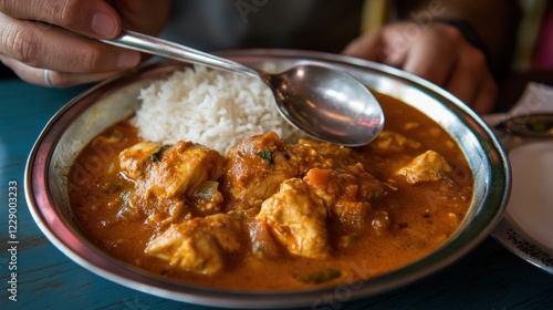 Close-up of a person eating chicken tikka masala with rice.