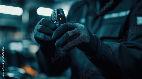 Close-Up of a Person Holding a Modern Digital Key Fob in a Dark Industrial Setting with Blue Lights and Protective Gloves