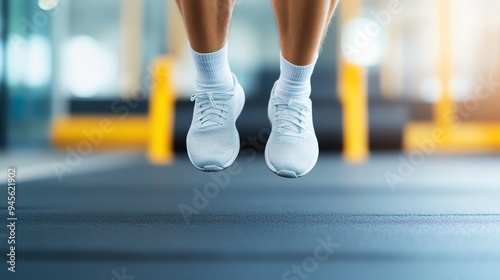 Close-up of a person performing explosive jump squats, with the background blurred to emphasize the speed and intensity of the workout, HIIT workout, explosive power