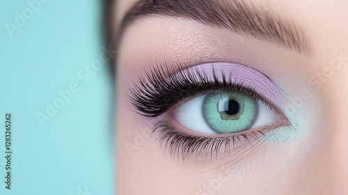 Close-up of a person's eye. the eye is a bright green color and is surrounded by long, full eyelashes. the eyeliner is a light purple shade and is applied in a way that creates a dramatic look.