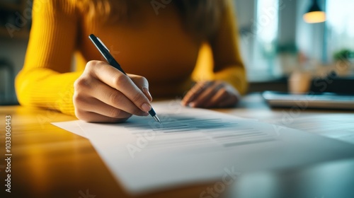 Close-up of a person’s hand holding a pen and writing on a document, with a warm and cozy indoor background