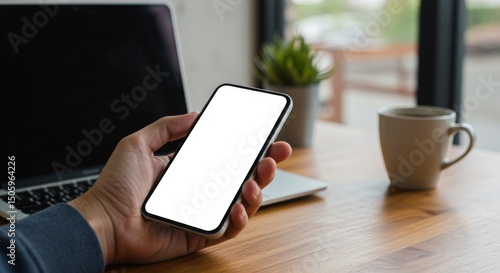 "Close-up of a person’s hand holding a smartphone with blank white screen, sitting at wooden desk with laptop and coffee cup in background, modern office interior, natural light, realistic photo."