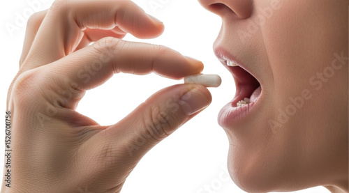 Close-up of a person’s hand holding a white pill near their lips, preparing to take medication. Isolated on a transparent background for medical or pharmaceutical themes.