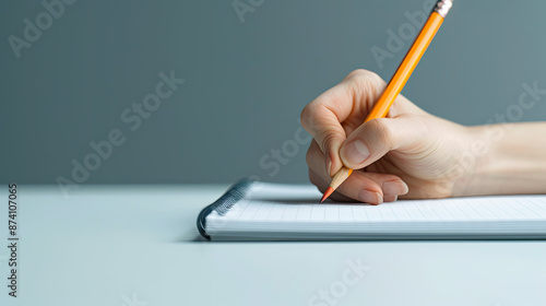 Close-up of a person's hand writing in a notebook with a pencil.