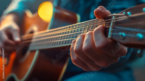 Close-up of a person's hands playing an acoustic guitar, with a blurry background.