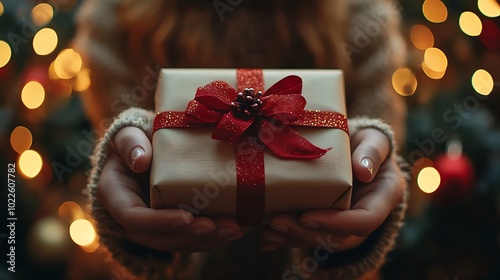 Close-up of a person’s hands presenting a neatly wrapped gift with red ribbon, blurred background featuring a festive wreath and twinkling lights, vibrant and lively holiday atmosphere, hd quality,