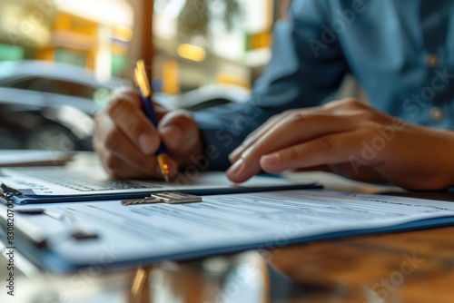 Close-up of a person's hands signing a document, focusing on the pen and paper. The photo captures the detail of a business transaction.