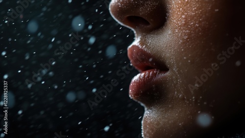 Close-up of a person's lips and skin glistening in the rain at night, creating an atmospheric and moody effect